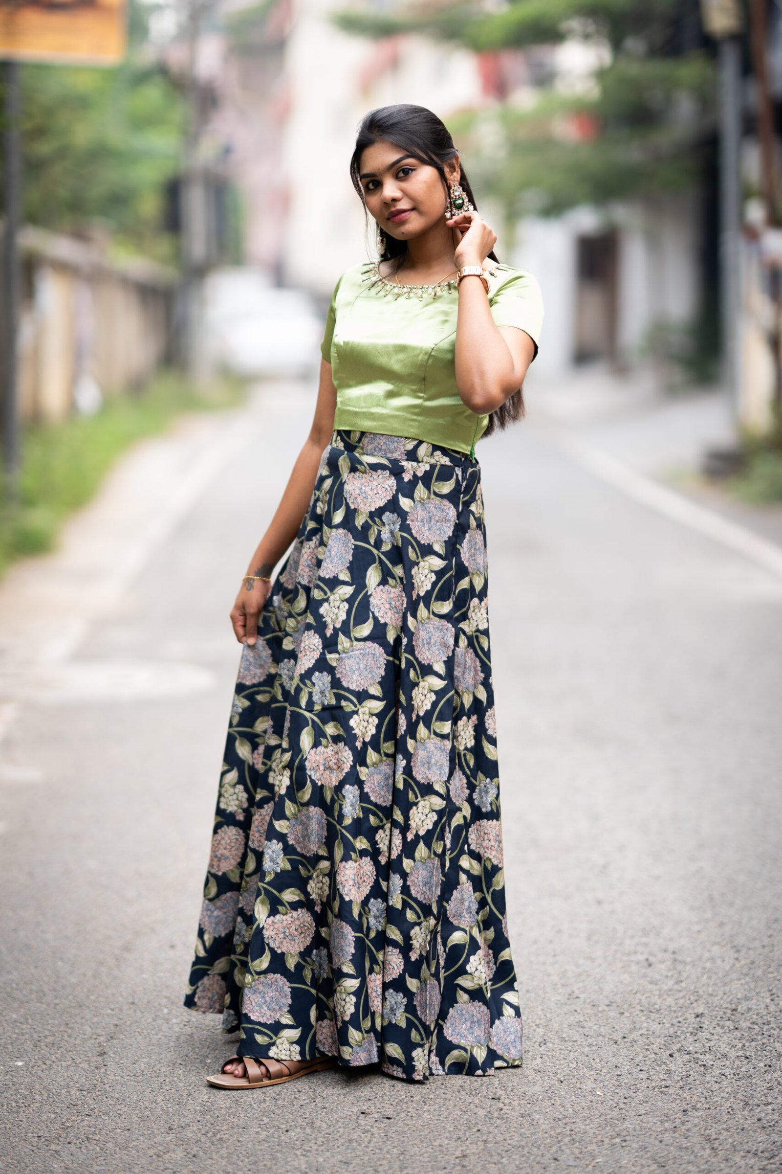 Floral skirt crafted from a soft blend of cotton, viscose, and rayon, paired with a crepe satin crop top adorned with intricate bead and stone handwork along the neckline